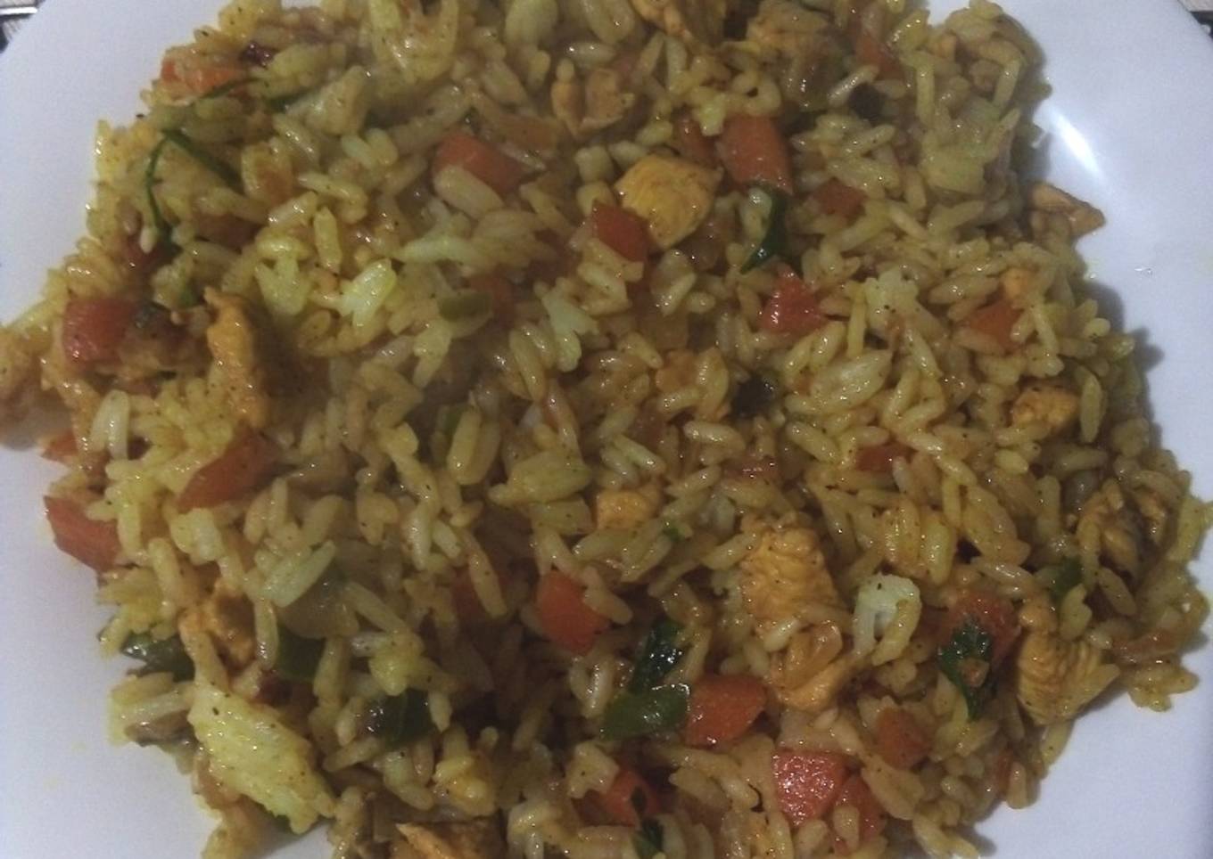 - Después añadimos la zanahoria y el pollo, añadimos las especias, la salsa de soja y el perejil y cuando el pollo ya esté hecho añadimos el arroz.