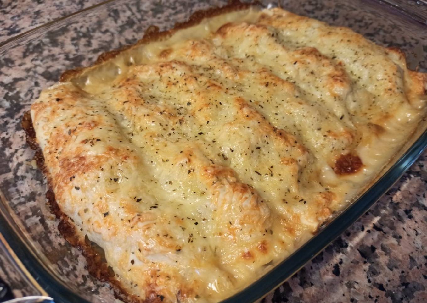 - En una fuente apta para horno se cubre la base con bechamel y se van poniendo los canelones, se agrega más bechamel por encima y se cubre con queso (yo usé Emmental rallado).
