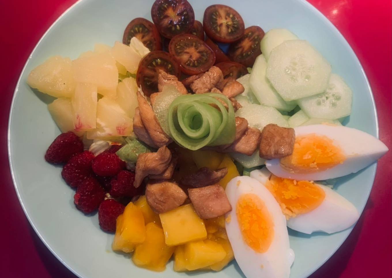 - Cortamos el pepino a rodajas, los tomatitos por la mitad, las frutas a trozos y la lechuga.