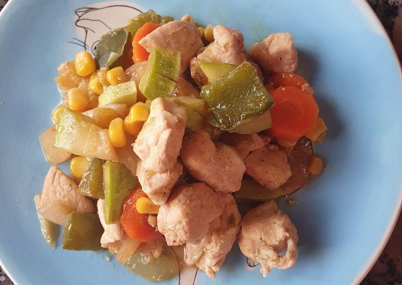 - Cuando esté sellado el pollo incluimos el calabacín y los brotes de bambú. Regamos con salsa de soja al gusto y echamos el maíz. Dejamos cocinar 15 minutos y servimos.