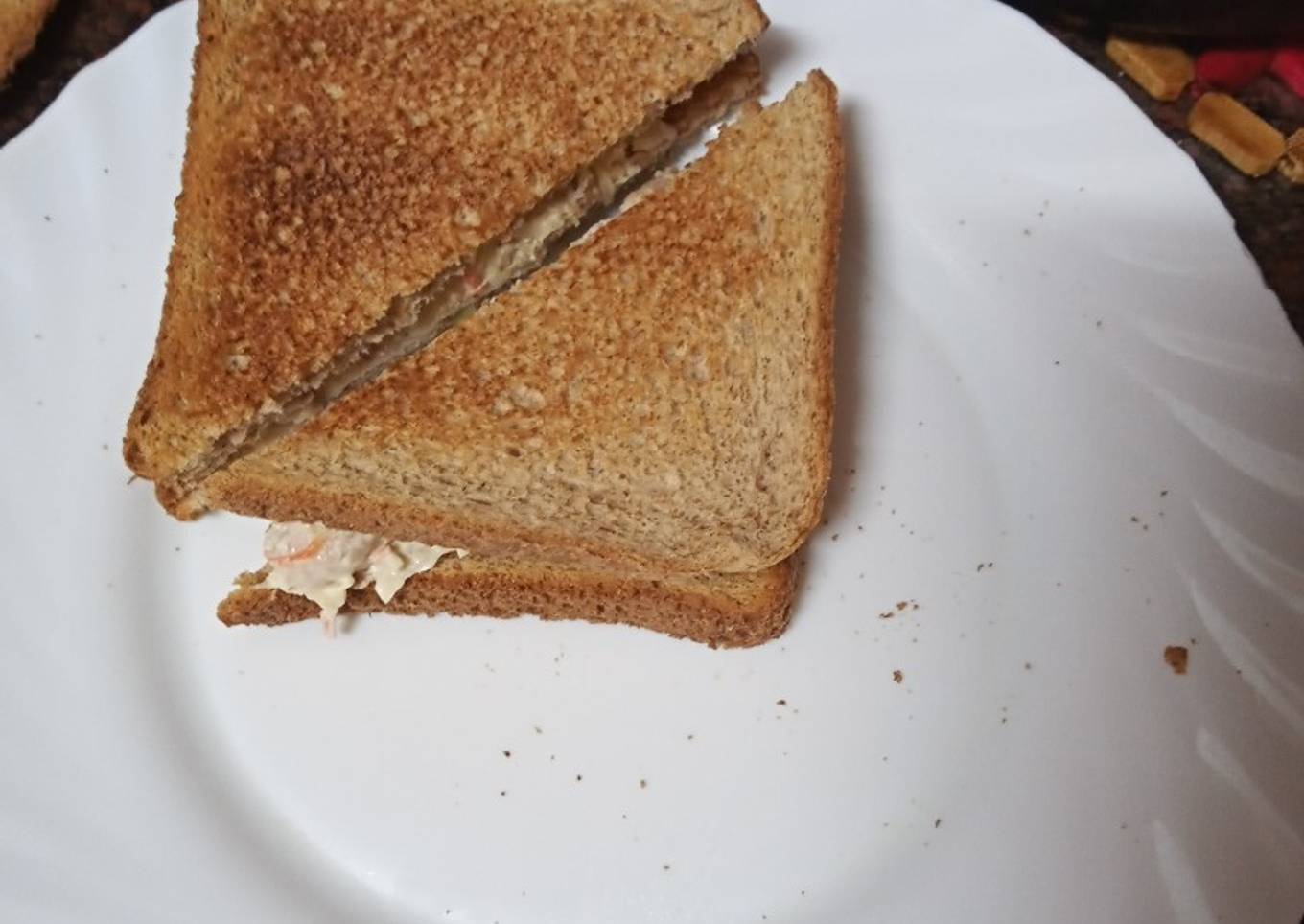 - Poner encima del pan tostado la ensalada, cerrar con la otra rebanada de pan. Cortar por la mitad el sándwich. Presentar en un plato llano el sándwich. Servir.