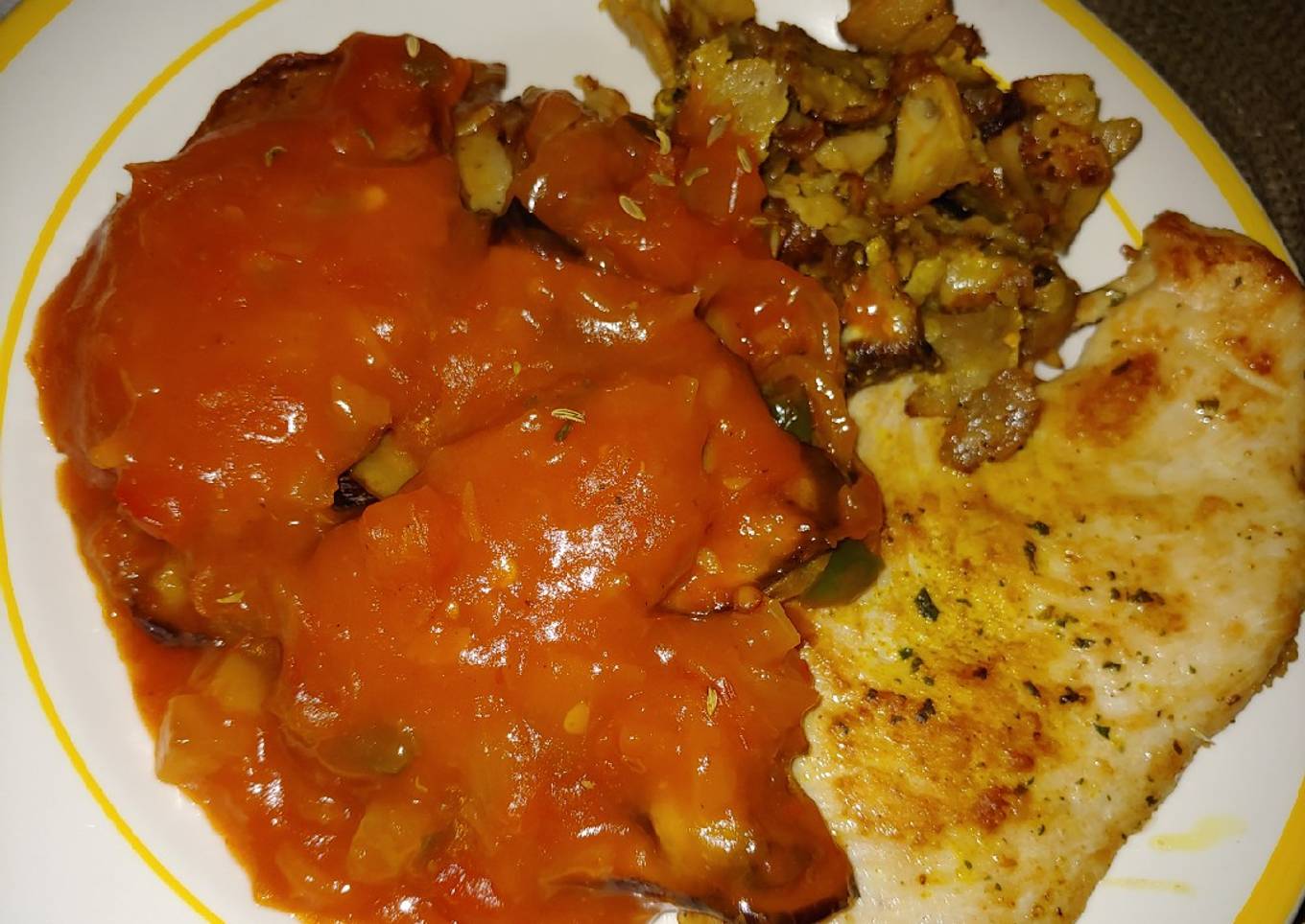 - En sartén aparte pasaremos el pollo desmenuzado y las pechugas poe plancha o sartén hasta dorar.las añadiremos a la bandeja del tumbet y los pasamos al horno 25 minutos para finalizar a 160 grado.Emplatar por separado o junto con tumbet.buen provecho.