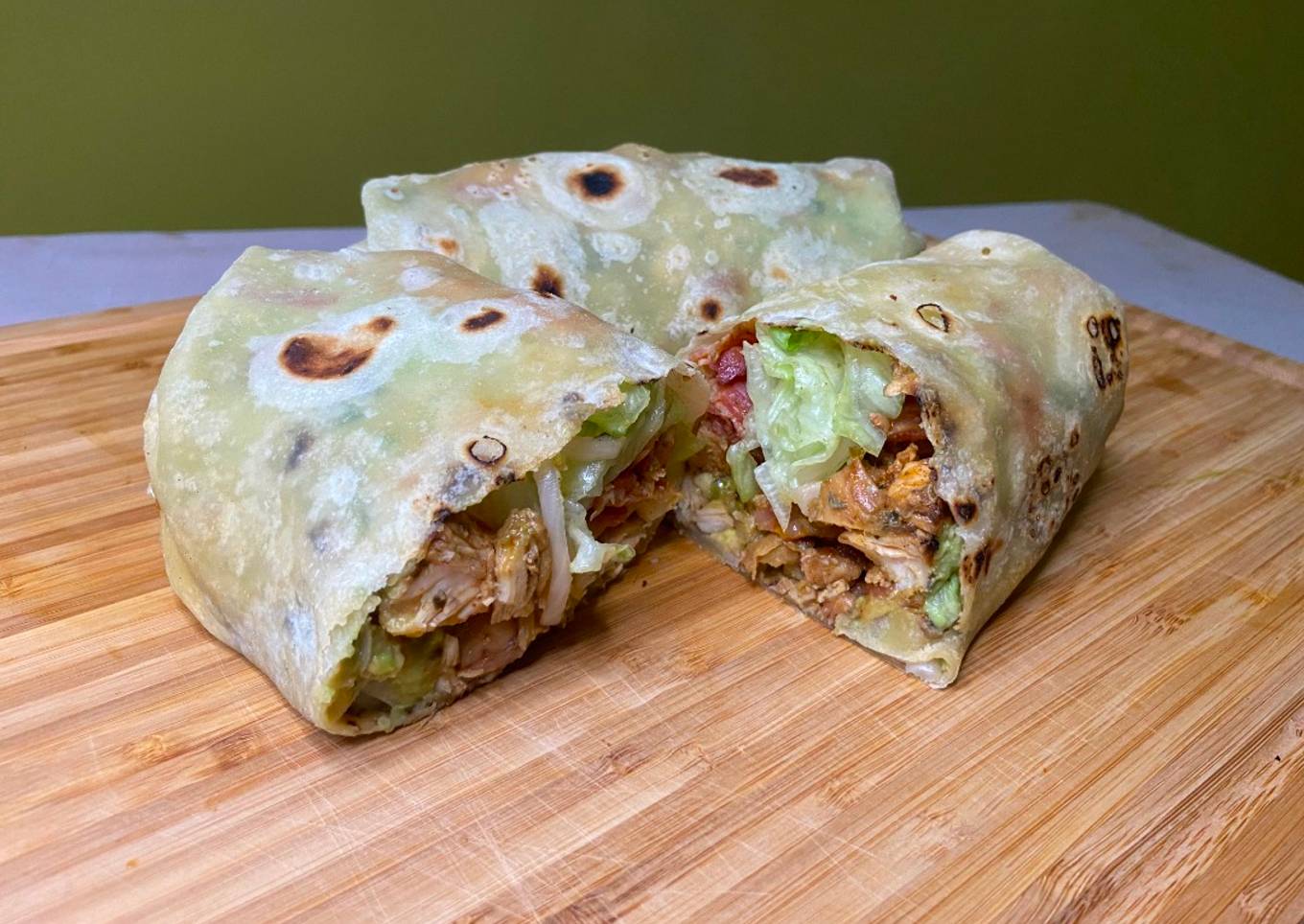 - Cortar el pollo y poner la mitad de ingredientes sobre cada tortilla. Formar una montañita en el centro y enrollar.