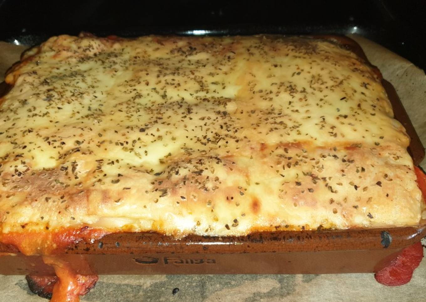 - En el recipiente extendemos el tomate en el fondo y comenzamos a montar. Lamina de lasaƱa, queso, bechamel y pollo con verduras. Hasta terminar con el relleno. Yo hice dos capas de relleno, por tanto tres de pasta. Y al final del todo queso y orƩgano.
