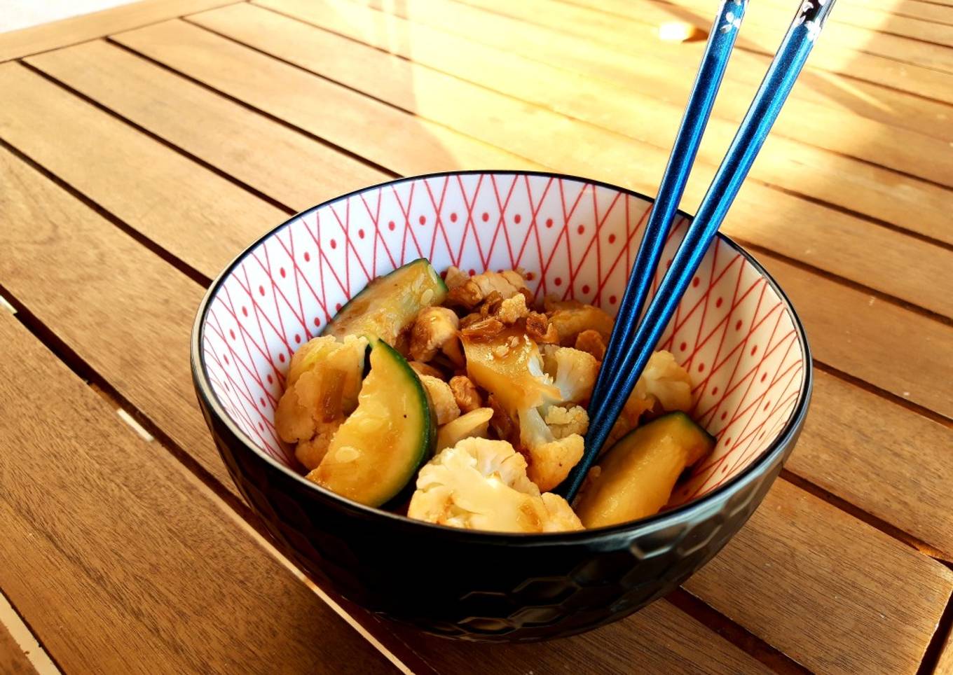 - Cortamos el calabacín y la coliflor en trozos medianos y los ponemos con agua y sal en la olla a presión. En cuanto suba el pitorro, paramos la olla sacando la presión y escurrimos. Queremos que la verdura quede al dente, por eso no la cocemos apenas. Añadimos al wok y salteamos unos minutos, añadiendo también un chorro de salsa de soja.