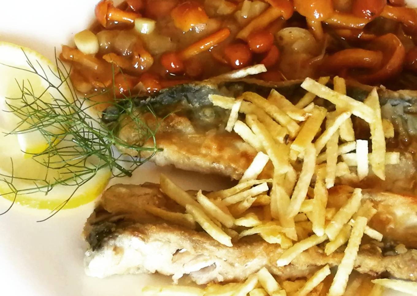 - Asentar una cazuela sobre el fuego. Verter 3 cucharadas aceite de oliva virgen extra y dejar calentar. Freír por los dos lados los filetes de caballa. Reservar los filetes de pescado en un plato.