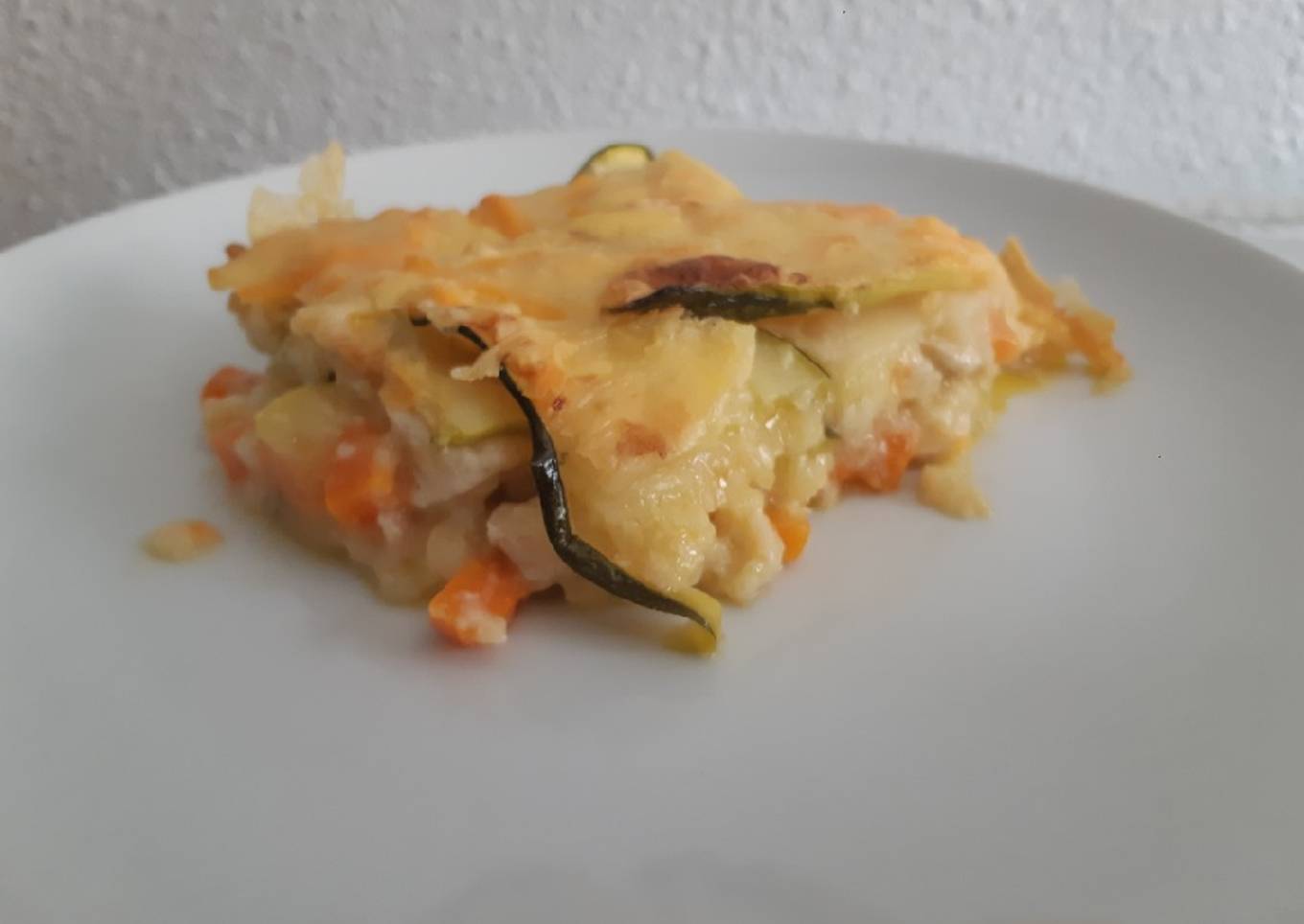 - Cogemos el recipiente donde vayamos a realizar la lasaña y pondremos una base de rodajas de calabacín y un pisito de la bechamel creada con la pechuga un otra capa de rodajas de calabacín y otra bechamel con pechuga así hasta acabarlo todo. Se acaba con la capa de calabacín se le pone queso rallado y gratinar al horno hasta que esté dorado el queso