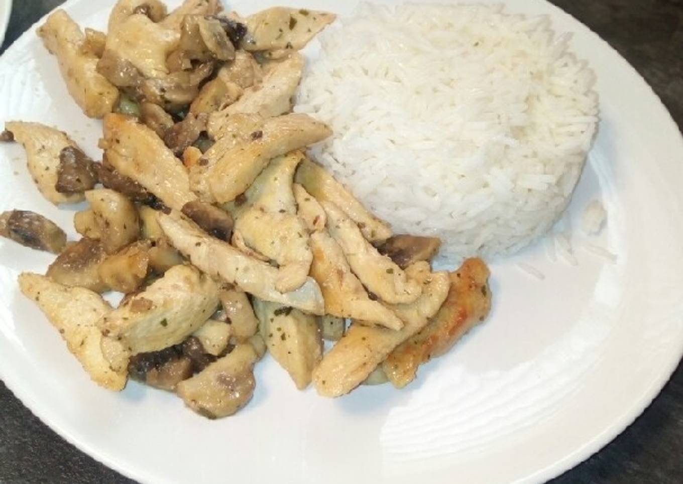 - Servimos el pollo y los champiñones acompañados del arroz.