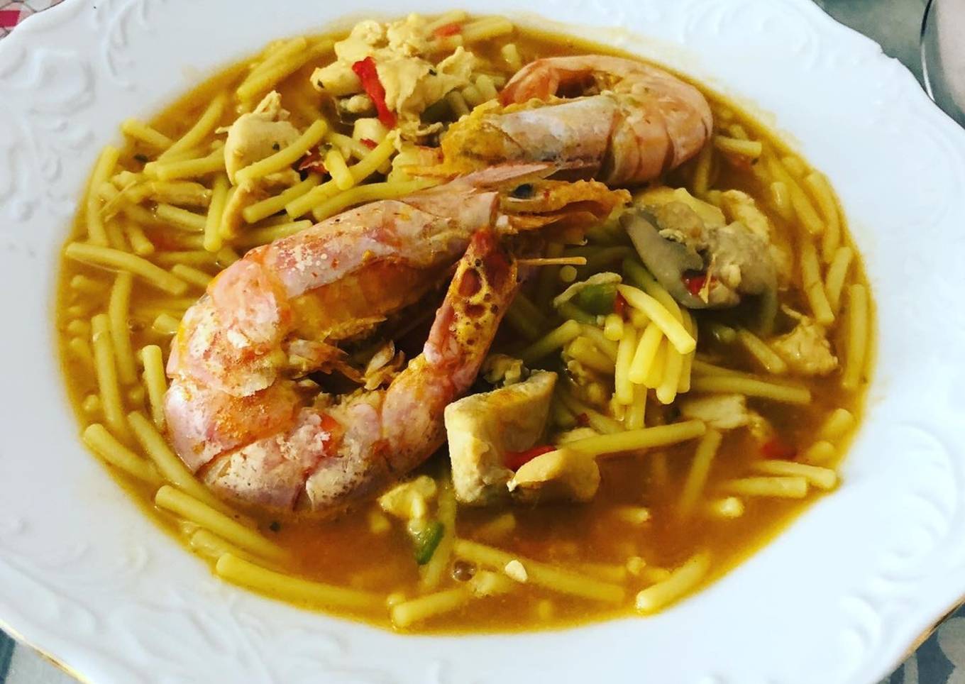 Pollo con fideos y gambones