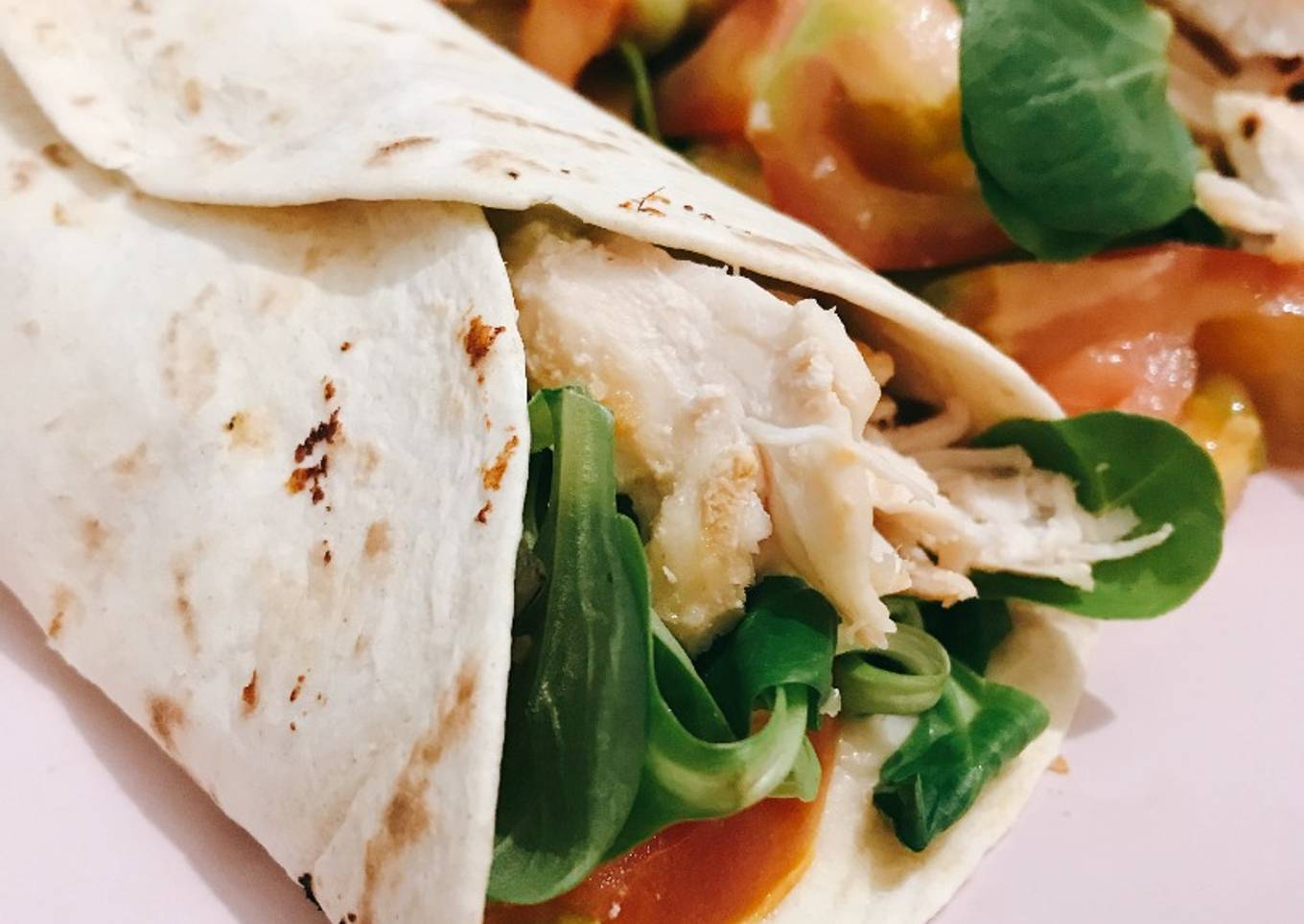- Calentamos las fajitas en un sartén y rellenamos con el pollo, brotes verdes y tomate.