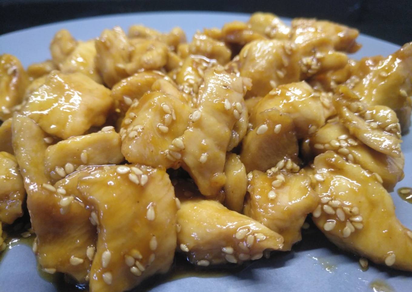 - Cuando tengamos el pollo cocinado, agregamos un chorrito de miel y un chorrito de salsa de soja, según cantidad de pollo.