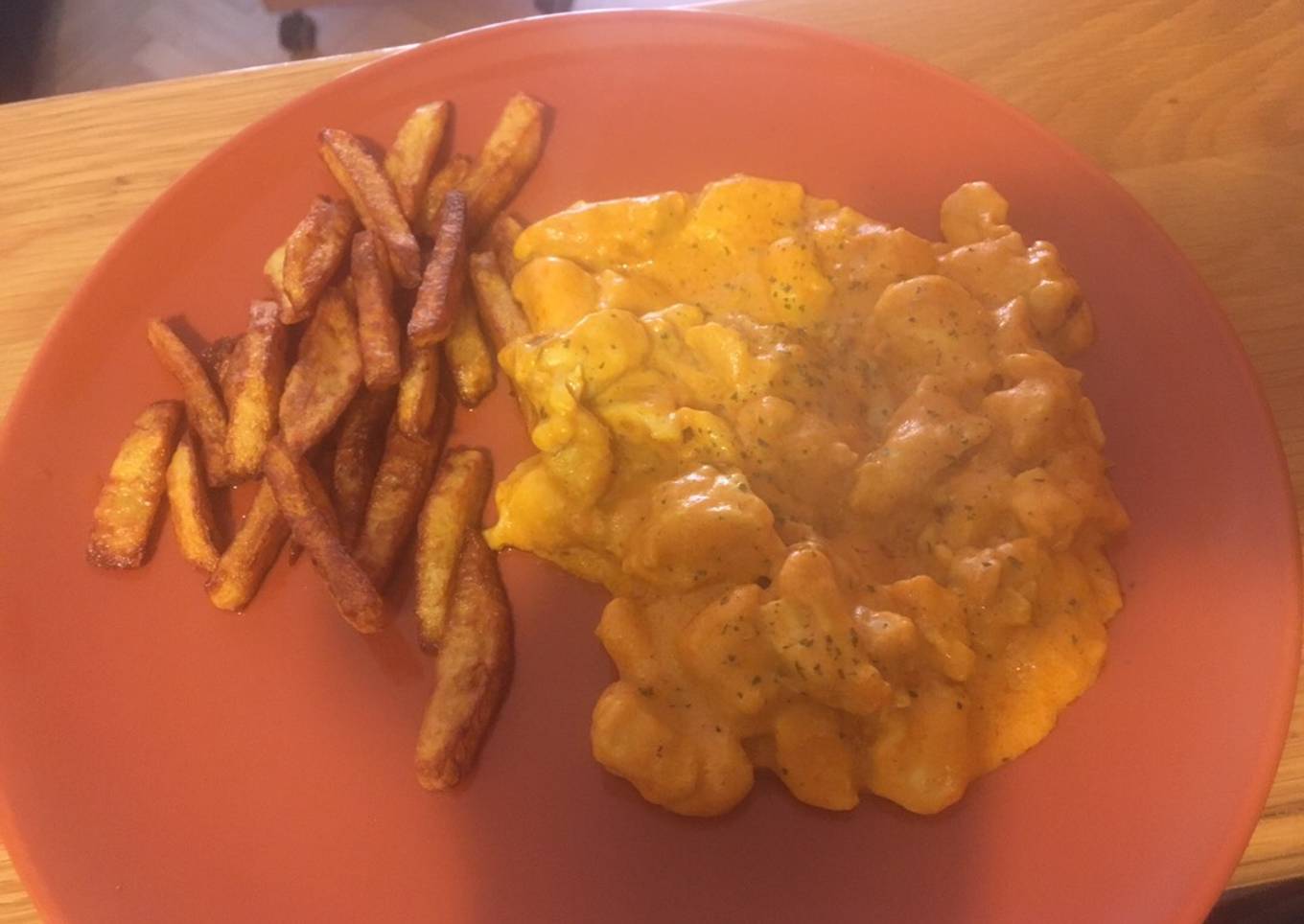 - Reservar el pollo, echamos el sofrito en la sartén, mezclamos con tomate frito y curry durante 2 minutos