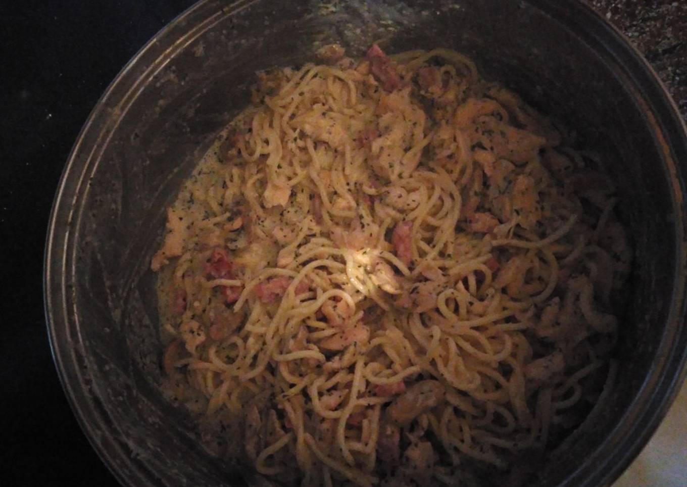 Spaghetti a la carbonara con pollo, bacon y champiñones
