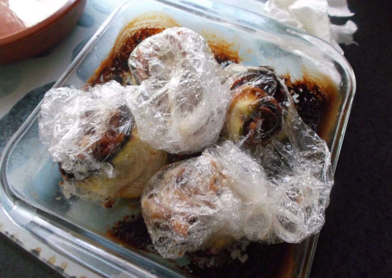 - Enroscamos todos los ingredientes y envolvemos bien con el plástico de cocina. Repetimos la operación con las tres lonchas de calabacín restante. Colocamos todos los paquetitos de calabacín bien envueltos en una bandeja.
