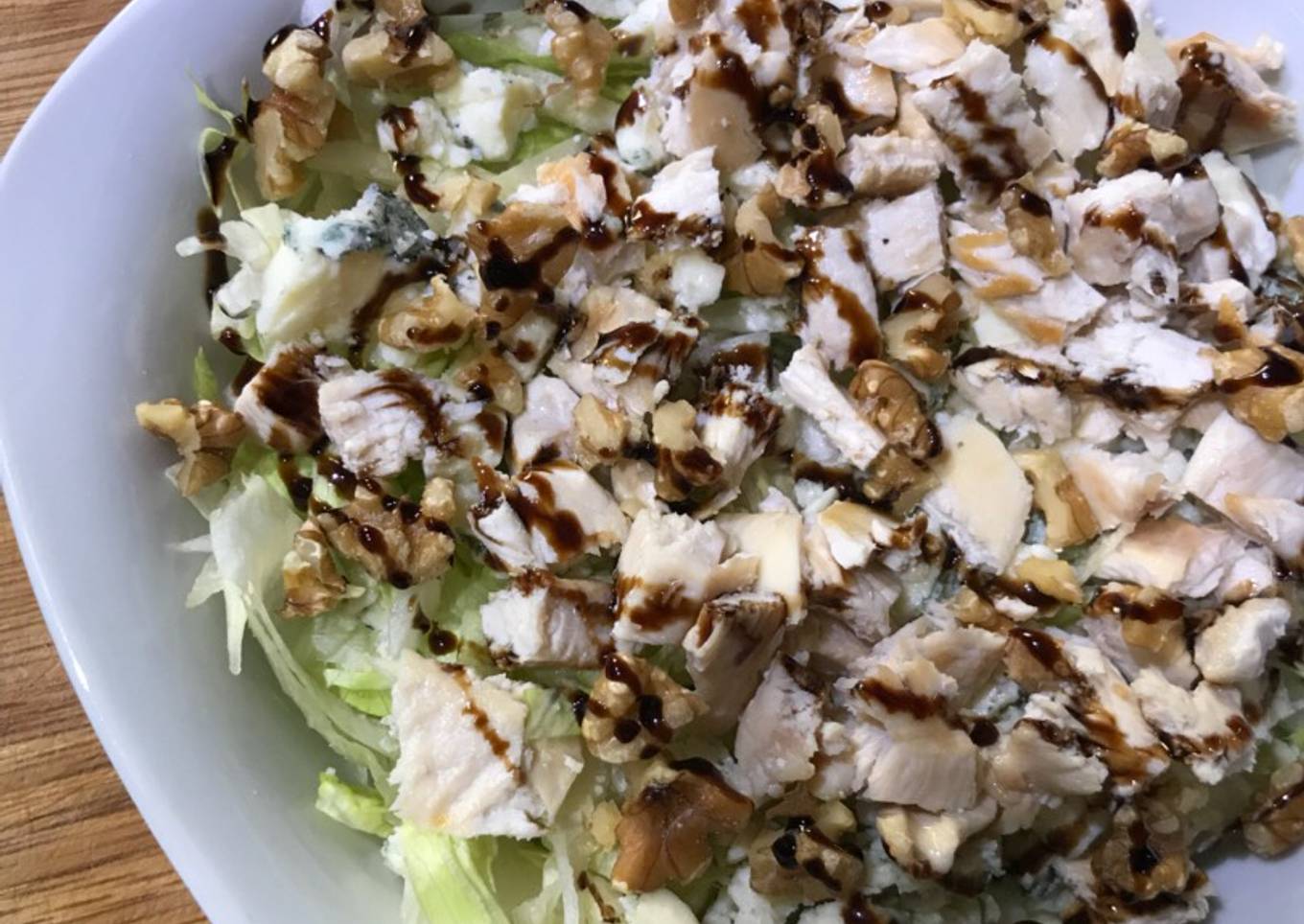 - Ponemos la lechuga previamente escurrida, añadimos los dados de pollo, el queso, unas nueces troceadas, aderezamos con el balsámico de Módena al gusto y ¡a disfrutar!