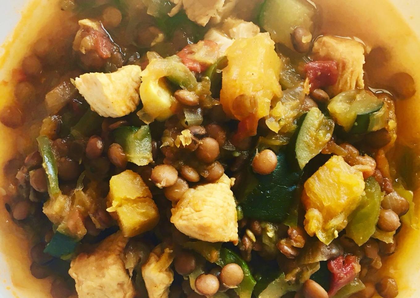 Lentejas de pollo y calabaza con toque de curry y Canela