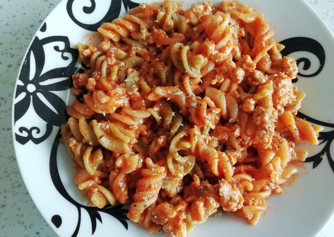 Macarrones vegetales con carne picada de pollo y orégano
