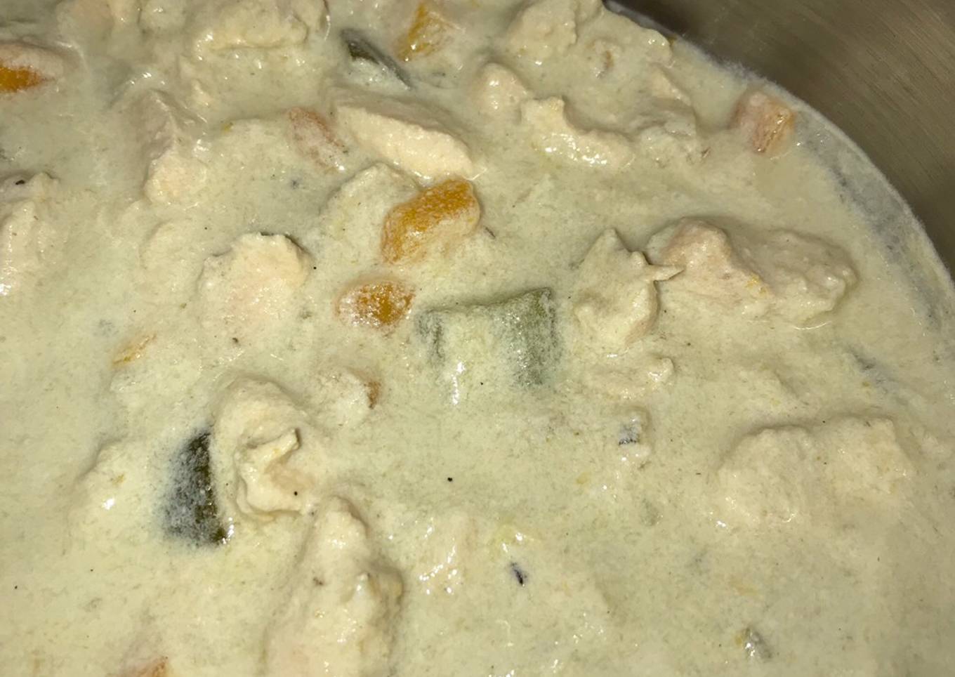 - Ya porfin echo el caldo y la leche de coco a la olla y subo el fuego un poco más y voy dándole vueltas que se vaya ligando lo remuevo de vez en cuando