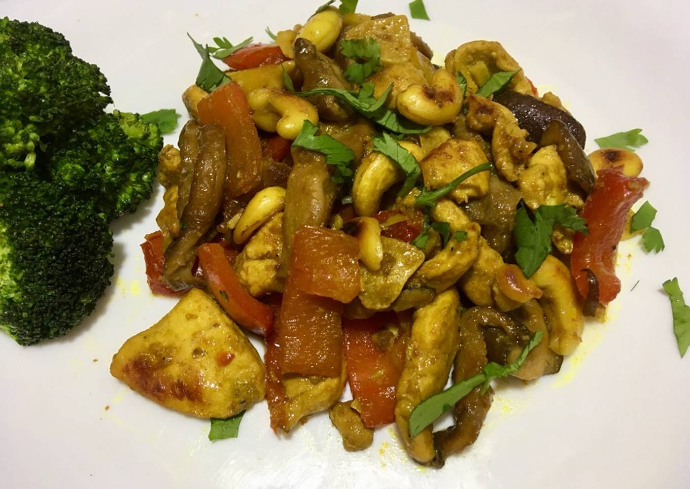 Pollo con shiitake y anacardos al curry