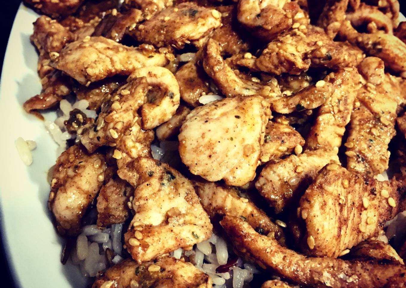 - En una sartén ponemos un chorrito de aceite de oliva y añadimos el pollo. Vamos añadiendo el resto de las especias y cuando está casi terminado añadimos el sésamo para que se tueste un poco